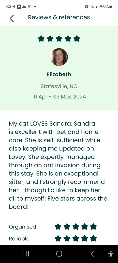 I really enjoy new adventures which include new places, people, and lifestyles. I’m very flexible with new situations and like to explore new areas. Animals seem to take to me so house and pet sitting is a good fit. I've had over 84 sits in the last 3 years, owned 3 cats, fostered over 40 cats, sat for 79 dogs, 61 cats, 30 horses, 41 birds, 15 chickens, 25 fish, and the list grows.